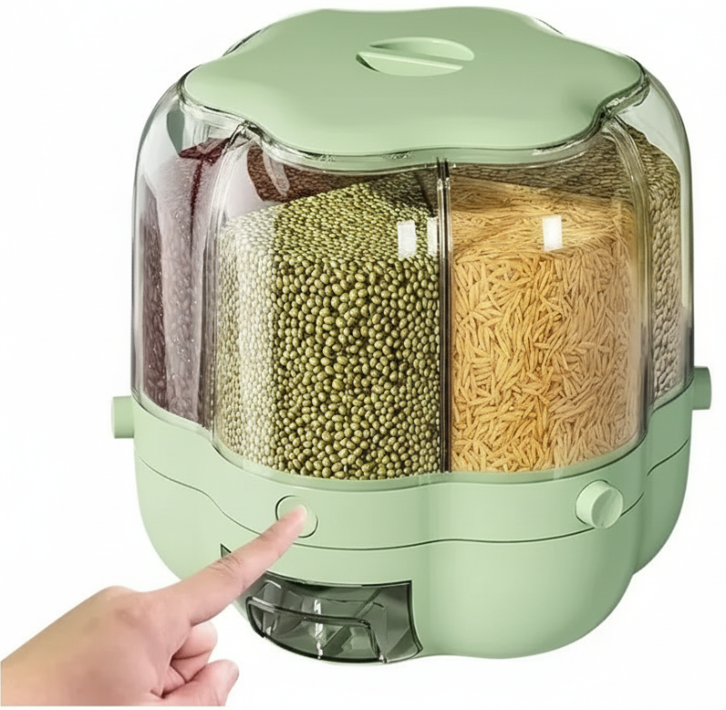 The 360° Rotating Grain and Rice Dispenser Container is a modern, space-saving solution for all your dry food storage needs. With its innovative rotating design, you can easily access rice, cereals, beans, pasta, or even pet food—just spin and dispense!